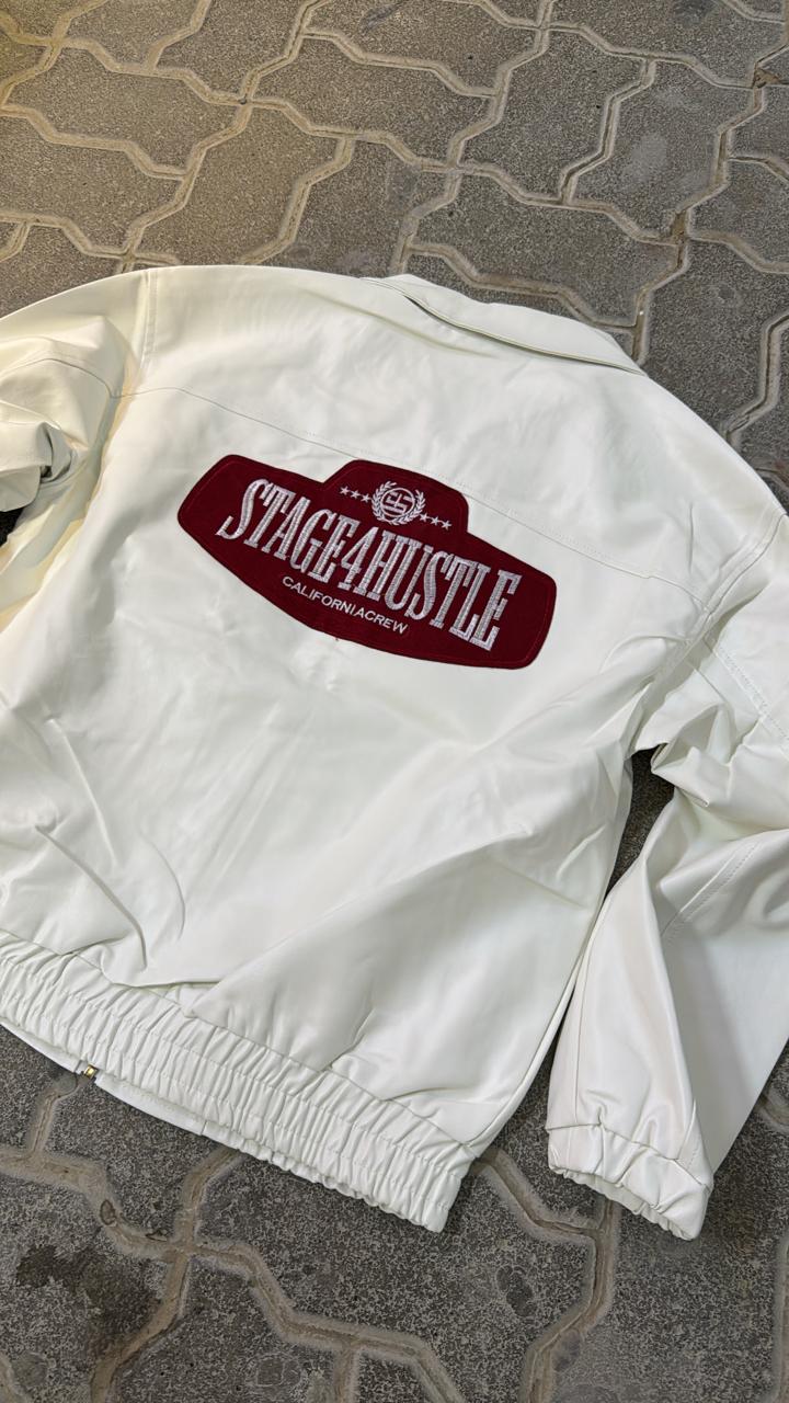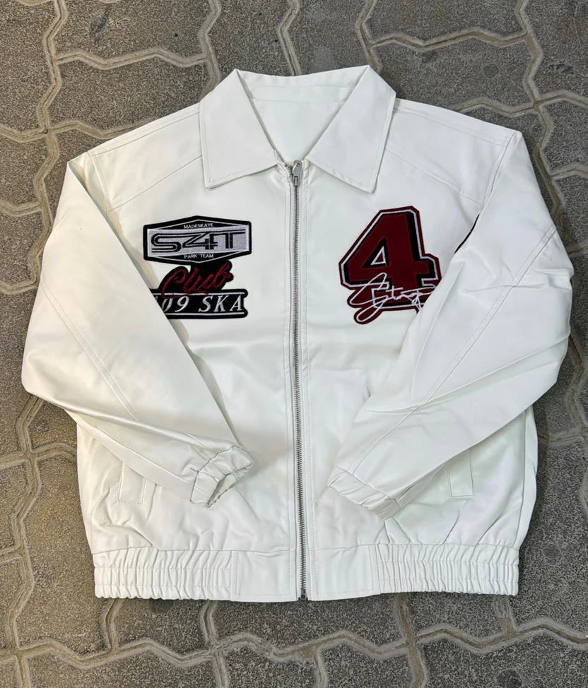 White Faux Leather Racing Jacket with Patches | Embroidered Red "4" & "Club SKA" Logos | Y2K Streetwear